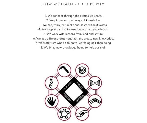 The joining lines are as important as the pedagogies themselves. Values, protocols, systems and processes refer to the ways of valuing (axiology), ways of being (ontology - protocols are rules for how to be), ways of knowing (epistemology) and ways of doing (methodology). When you engage with Indigenous communities at this level, you truly have the potential to embed broad and deep Indigenous perspectives.