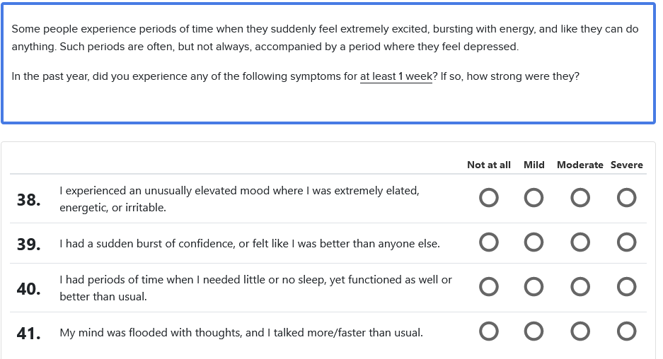 "...it is highly advisable that you seek professional help for diagnoses highlighted in these results, or any areas where you are symptomatic. Please note this screening does not cover all disorders. Only the following conditions are assessed: substance used disorder, major depressive disorder, manic episodes, bipolar disorder, post-traumatic disorder, generalised anxiety disorder, panic disorder and panic attacks..."