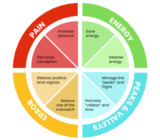 NB The default position of the brain is to assume the worst scenario, ie errors signal; need to manage negative expectations. the higher the error signal, the greater the pain experienced and the cycle repeats itself, ie pain, energy, fluctuations, errors signal, etc.
