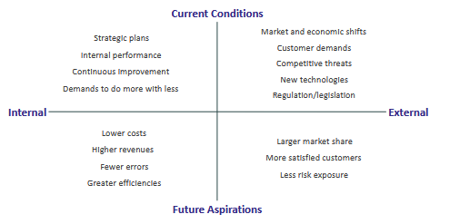 a) Understanding part of why includes investigating the drivers of change (Are drivers internal and/or external and what are the current conditions and future aspirations?):