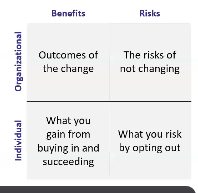 | 2 | Organisational change requires individual change, ie the organisation changes because individuals within the organisation change | Who has to do their job differently (and how)? What is in it for me (WIIFM), ie what do I gain or lose from the change? What are the risks for me, if I do or don't participate? |
