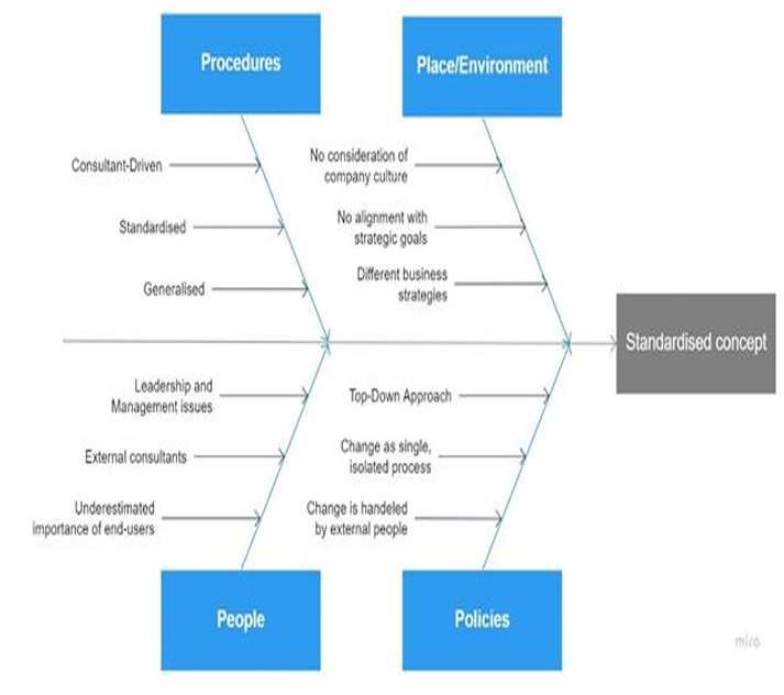 "... There are several actions that can be identified quickly to resolve the problem of standardised concepts. Including external consultants can be helpful with their expertise in handling change, in addition to their neutrality and persuasiveness. However, they are only beneficial if they tailor their solutions individually to your organisation. Regardless of whether or not a change project is led by external consultants, it needs to be adapted to the organisation's culture and business environment as well as aligning the organisation's strategic goals and business strategies. In this manner, a customised approach can be developed that fits the organisation's needs. In addition, the leadership approach needs to focus on the role of leaders and managers of change and on a sustainable and quality enhancing employee participation. 'There is no universal theory of corporate change. However, a standardised format can give guidance when managing change. To be successful with a change initiative, it is important to adapt strategies and theories to the individual situation. If this is not the case, change initiatives will further fail..."