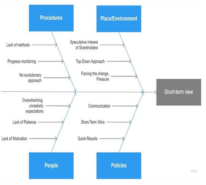 "...not only covers the reasons for a short-term view but also has consequences and associated corrective actions. If top-management pressures its employees to implement a big change in a short amount of time, it can result in the employees being unmotivated and overwhelmed. Hence, it is essential to be patient and make the change a long-term project that includes an evolutionary process. However, long-term projects can also be demotivating. Therefore, it is helpful to plan and create short-term wins that show a rapid implementation success as they can help build momentum and support for the change. This can then motivate employees and facilitate the effort to expand inside the organisation. The setting of a clear and realistic timeframe can be beneficial in monitoring progress and supporting the taking of corrective action as soon as possible..."