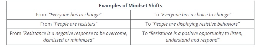 i) promote mindset shifts (from 'how do you manage resistance to change?' to 'how do you build readiness for change?)