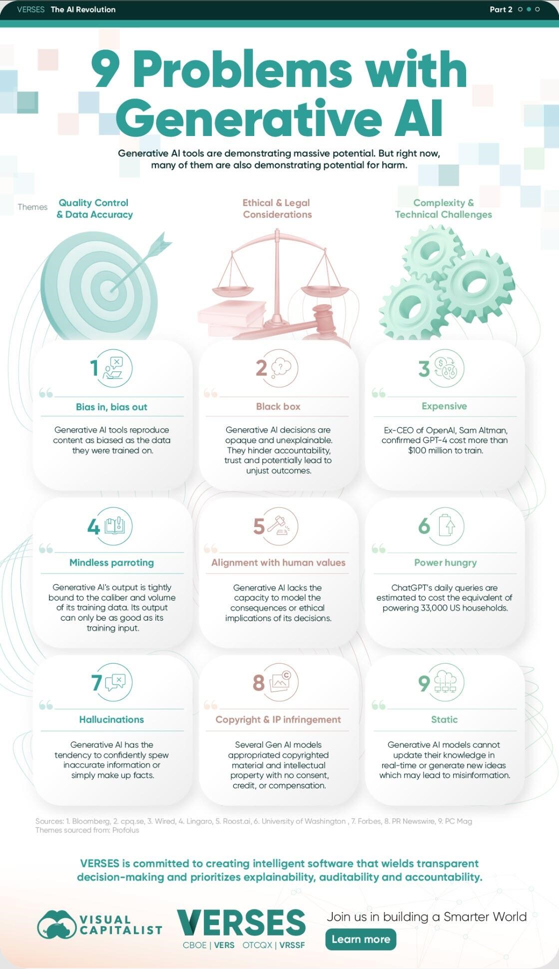 - What’s the issue? Generative AI can convincingly fabricate text, images, audio, or video—making it easy to spread false or misleading content; cannot update their knowledge in real time or generate new ideas.