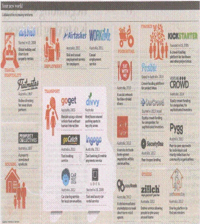 Other companies include car sharing networks, skills exchanges, crowd financing for banking and investment; shared workspaces, new marketplaces for unwanted goods, etc (see attached diagram on collaborative economy ventures)