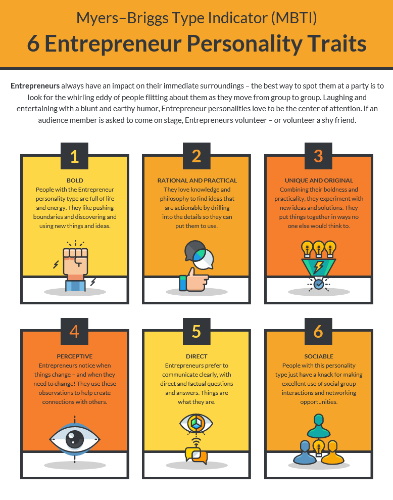 Entrepreneurs have a particular set of these traits, especially the last three, ie openness, conscientiousness and agreeableness.