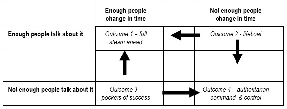 Outcome 1 ‐ full steam ahead; a critical number of people change in time and openly discuss the need for change to behaviour (including their own behaviours), ie talk about it. The ability to meet a deadline depends on how quickly and effectively the new behaviours and practices percolate through your organisation