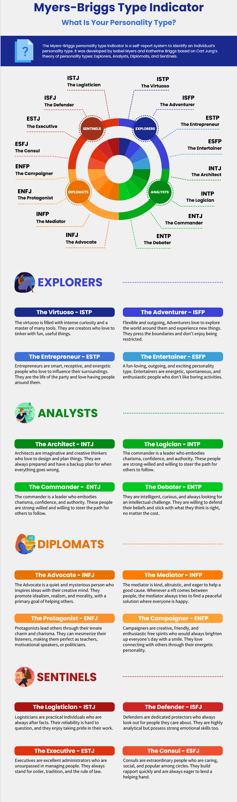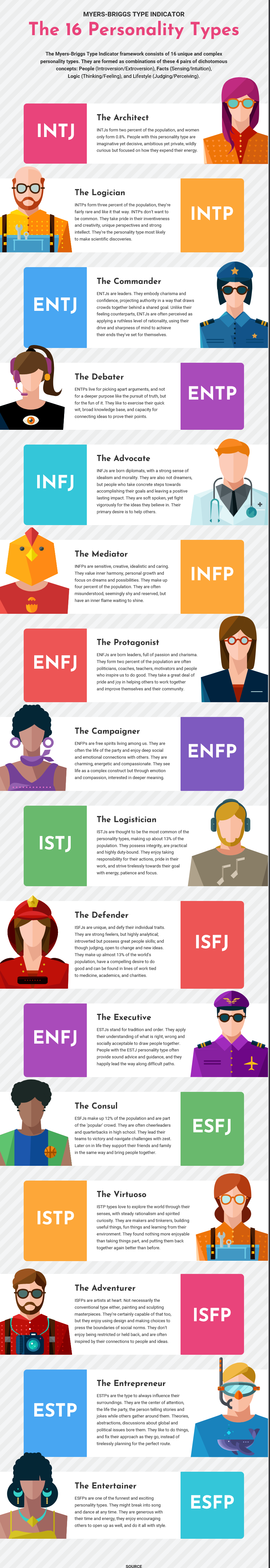. MBTI describes 16 different people types by 16 combinations of letters, namely ISTJ, ISFJ, INFJ, INTJ, ISTP, ISFP, INFP, INTP, ESTP, ESFP, ENFP, ENTP, ESTJ, ESFJ, ENFJ and ENTJ. Each type is different from the others in important ways and the concept suggests that people's behaviours are not random. There are "psychological types" in the way people prefer to perceive and make judgments. In fact, there are