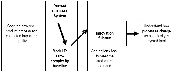 The Model T Analysis is a way to discover where your innovation fulcrum is. First you determine the process cost of selling an absolute minimum number of standard products, like Henry Ford's one-size-fits-all 1920s Model T. Then you add variety back into the business, product by product or service by service, and carefully forecast the resulting impact on customer sales and costs across the value chain (include operations, marketing, supply chain management, etc). You need to choose a configuration that is average in terms of content, cost and cycle time throughout the system. When the analysis shows the costs beginning to overwhelm the annual revenues, this is your innovation fulcrum. Sometimes organisations have more than 1 base product/service, eg