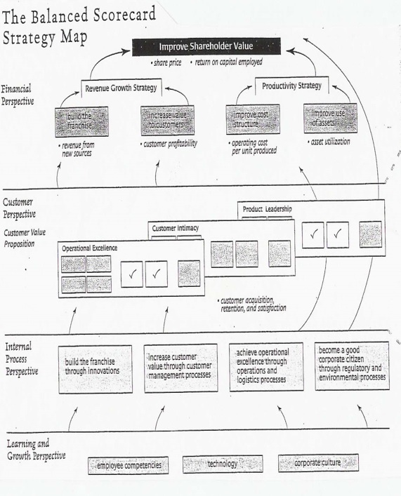 . The strategies need to have a balanced measurement system around the 3 dominant groups of constituents: employees, customers and shareholders. A strategy needs to describe how an organisation will achieve its desired outcome of satisfying employees, customers and shareholders. The how must include the value proposition in the customer perspectives; innovation, customer management; running processes in internal process perspective; employee skills and information technology capabilities in the learning and growth perspective
