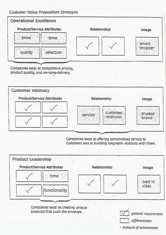 . Generally, organisations strive to excel in 1 of the 3 areas, while maintaining threshold standards in the other 2. By identifying its customer then value proposition, an organisation will then know which classes and types of customers to target. This is the single most important step in determining a strategy.