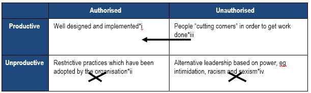 . Unauthorised and counter-productive systems - these are really dangerous systems and processes in the organisation. They are generally covert and designed to work against the purposes of the business and are hidden and denied. These systems may involve sexism, racism or dishonest practices, and can lead to favouritism and nepotism backed up by harassment and intimidation. In some organisations, these systems remain hidden because of the pressure not to "grass" or "dob someone in". If condoned, they promote an alternative leadership structure based on power, not authority or style