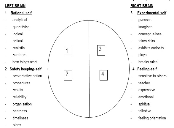 "...The brain is specialised ‐ not just physically, but mentally as well. Its specialised nodes can be organised into four separate and distinct quadrants ‐ each with its own language, perceptions, values, gifts and ways of knowing and being. We are all unique composites of differing modes according to our particular mix of mental preferences and avoidances..."