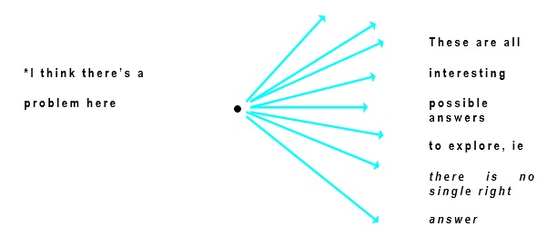 Divergent thinking is creative thinking that is not concerned with looking for solutions but is looking for many ideas that may lead to possible solutions. It goes in many different directions to look for possibilities and may appear not to be moving towards the solution.