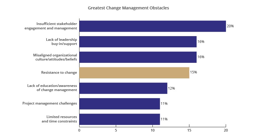 The graph below shows the importance of handling resistance to change; in fact, most of the other factors mentioned, from insufficient stakeholder engagement and management to limited resources and time restraints could all come under resistance to change.