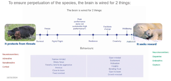 NB The main role of the brain is to ensure the survival of the species; this is achieved by protecting from threats and seeking rewards. However, current threats and rewards are different from those our ancestors faced in the caves and on the savannah grasslands; Today, change is seen as a major threat with its uncertainty and frequency.