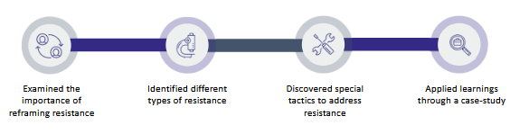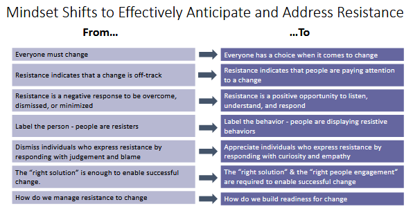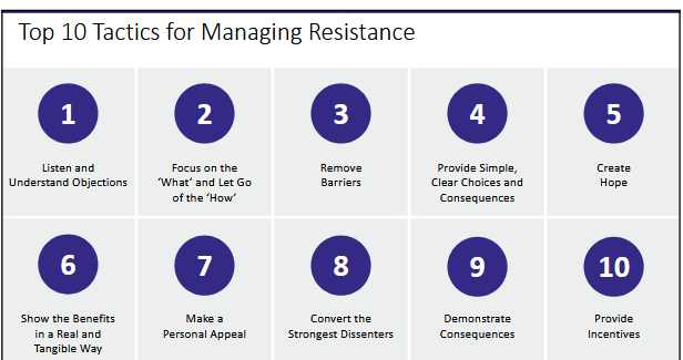 The first tactic, ie listen and understand the objections, is pivotal for managing resistance; the other tactics are not as important; be consistent in your communication.